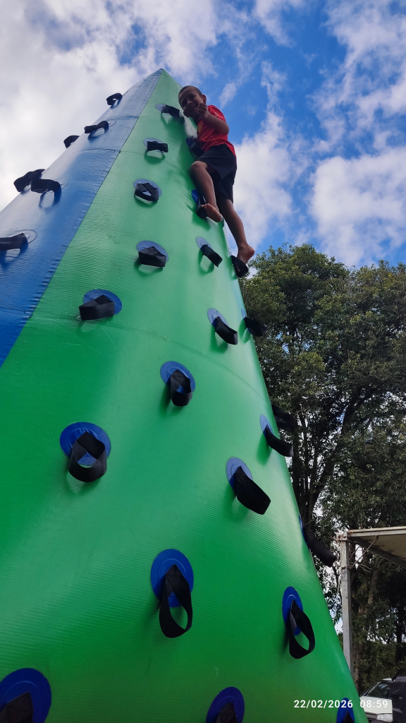 Para a alegria das crianças, o evento contou com cama elástica, brinquedos infláveis e brincadeiras tradicionais como perna de pau, promovendo integração entre gerações.